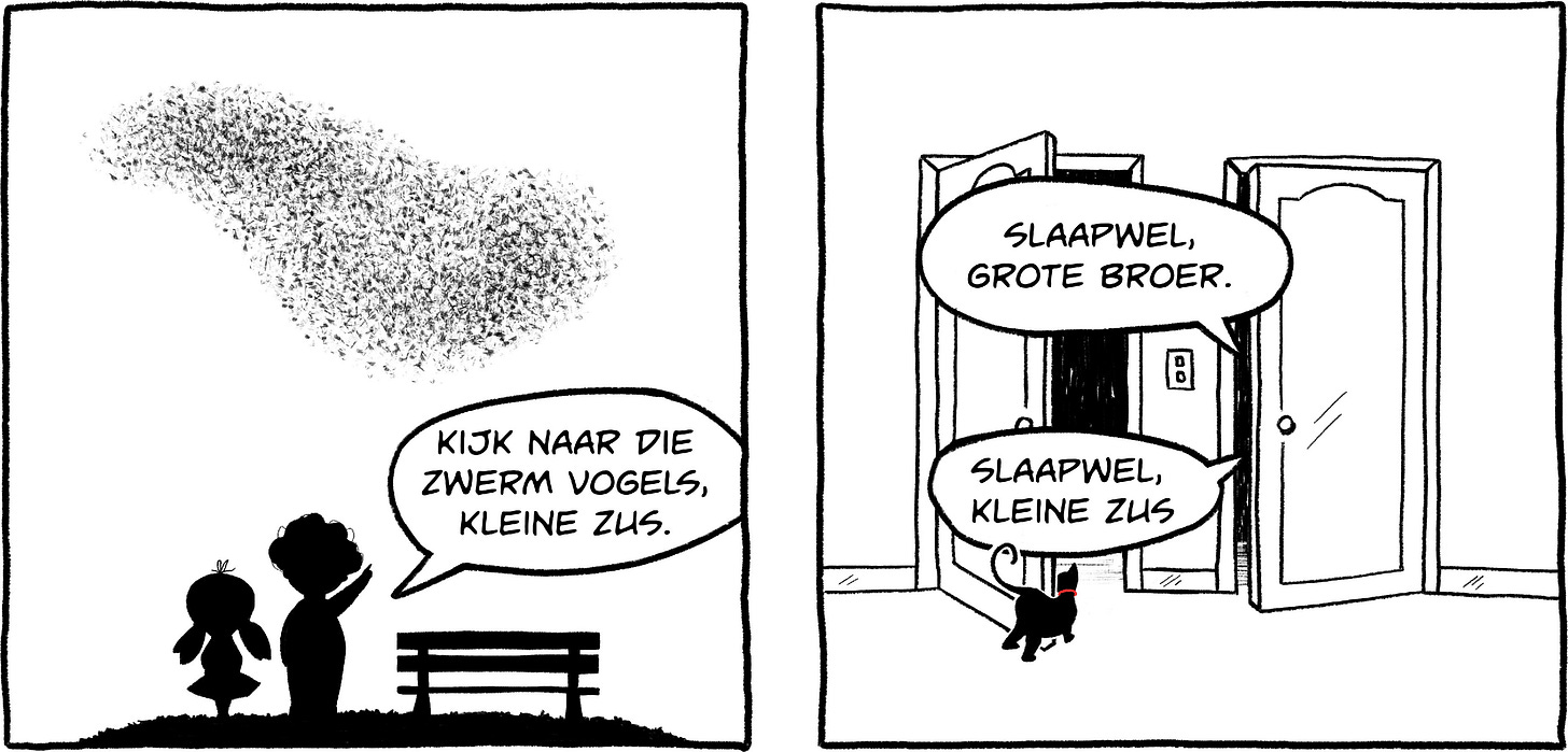 Inspiratie haal ik zo dichtbij mogelijk. Misschien herinner je nog de vijfde strip, met de zwerm vogels? Die zwerm zie ik elke dag, wanneer ik met Billie naar school wandel. Of de kamers uit de derde strip? Die zijn getekend naar de kamers van mijn kinderen. Alleen gaan hun deuren naar binnen open, terwijl dit in de strip naar buiten is, omdat dit beter voelde voor het narratief. Zelfs Mio, onze poes, kreeg een rolletje.
