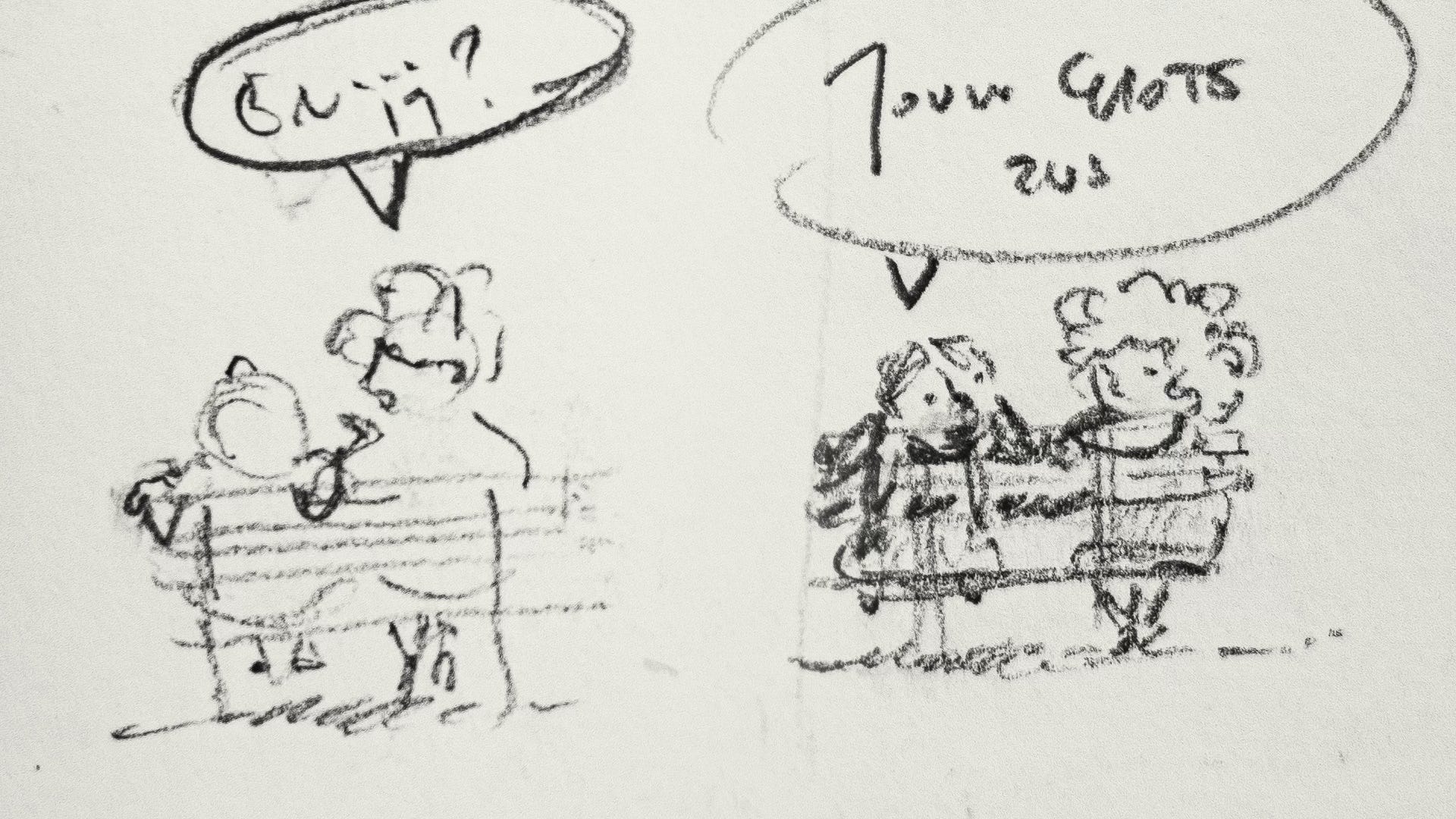 Hieronder zie je zo’n kriebelkrabbelschets van twee strips die ik eerder deelde in Brief uit het atelier.