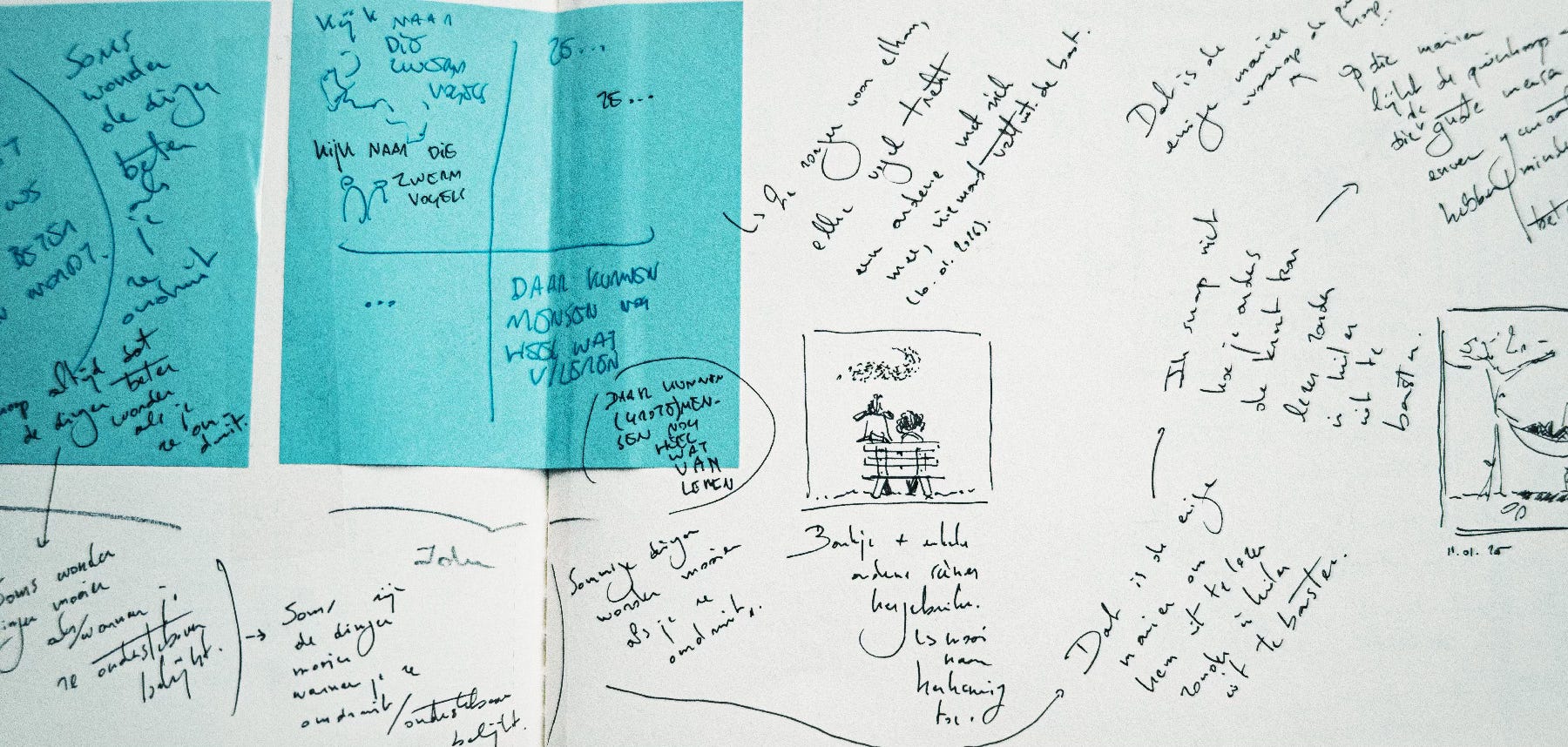 Nog meer dan anders hou ik m’n schetsboek dichtbij om ideeën neer te kriebelen. En het is echt kriebelen. Omdat ideeën de neiging hebben om over elkaar te buitelen in je hoofd om als eerste op papier te belanden, teken ik ze slordig en snel in m’n schetsboek. Alleen zo raken ze niet vergeten.